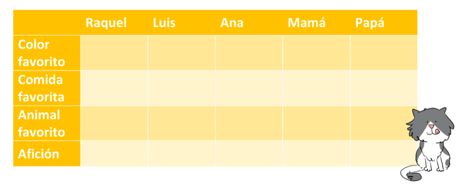 Para conocer mejor a la familia Quelío solo tienes que completar este cuadro con el color, la comida, el animal y la afición favoritos de cada uno de ellos. Abajo tienes las respuestas para encajar cada una en la casilla correspondiente del cuadro y las pistas para averiguar cuál es su lugar. iCompleta el cuadro y demuestra lo buen detective que eres!